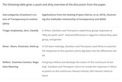 Jackson, K. (2014). Qualitative Data Analysis Software, Visualizations, and Transparency: Toward an Understanding of Transparency in Motion. Paper presented at the Computer Assisted Qualitative Data Analysis conference, May 3, 2014. Surrey, England.